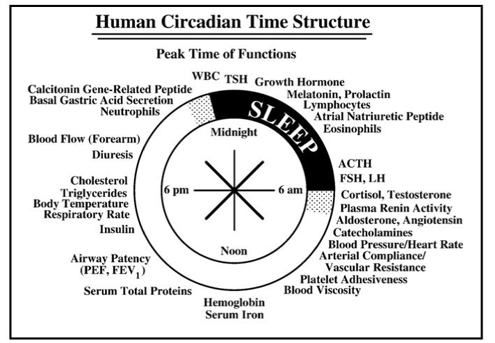 Merupakan siklus perubahan proses fisik, biokimia, dan perilaku suatu organisme yang terjadi secara berulang setiap 24 jam. Ritme sirkadian berperan mengendalikan berbagai proses, seperti: pola tidur, pelepasan hormon, metabolisme sel, sistem kekebalan, regulasi suhu tubuh dan tekanan darah. Salah satu contoh fungsi tubuh yang berkaitan dengan ritme sirkadian adalah sekresi hormon melatonin oleh kelenjar pineal. Hormon yang bertugas mengatur pola tidur ini akan meningkat pada malam hari, sehingga menimbulkan rasa kantuk. Struktur ritme sirkadian yang menggambarkan waktu puncak berbagai proses dan fungsi tubuh dapat dilihat pada Gambar 1.