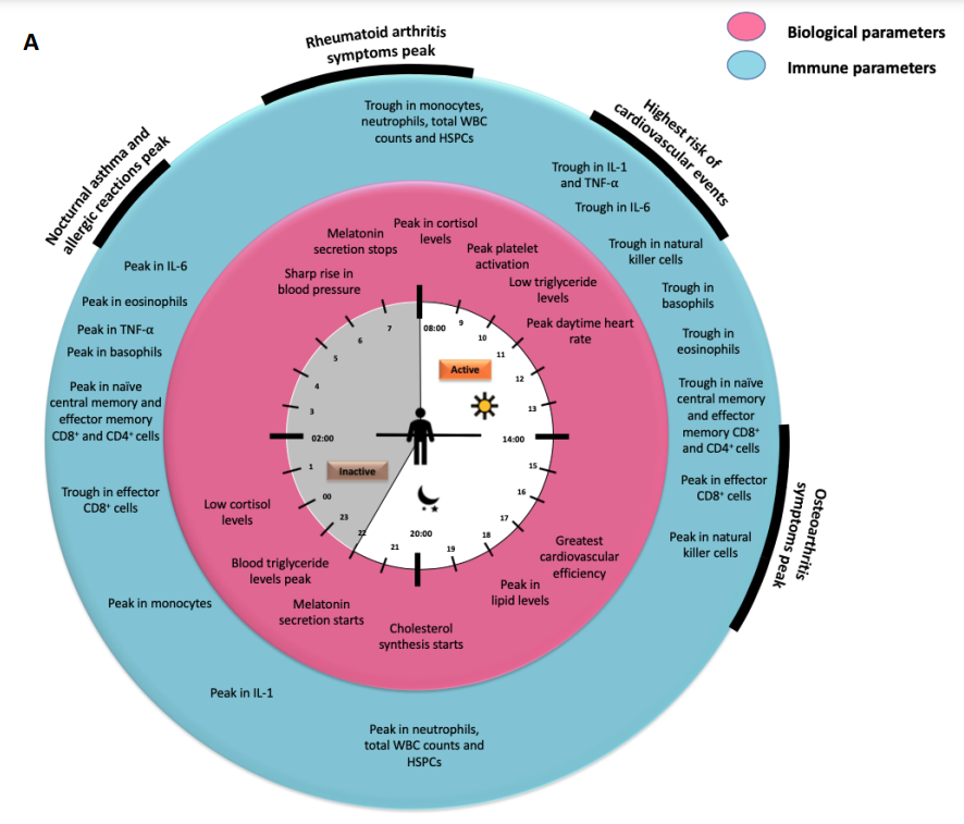 Beberapa studi klinis yang membandingkan pemberian terapi RA pada malam dan siang hari menunjukkan pemberian Prednisone, obat antiinflamasi non-steroid (Contoh: Ketoprofen), dan Methotrexate di malam hari dapat mengurangi efek peningkatan aktivitas sitokin proinflamasi, serta memberikan perbaikan gejala auto-imun di pagi hari yang lebih baik dibanding pemberian pada siang hari.