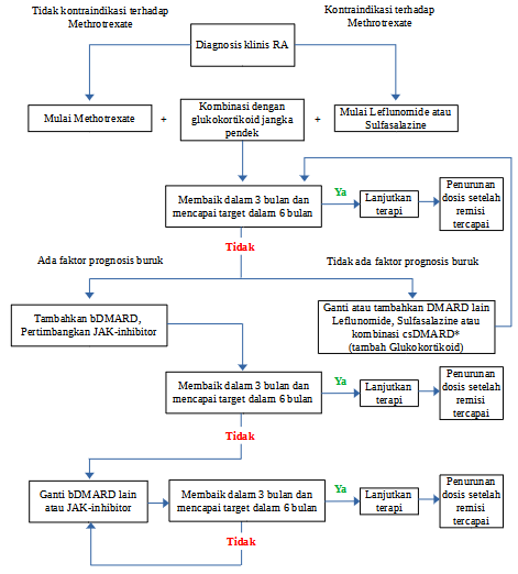 - Terapi bDMARD diberikan sebagai kombinasi csDMARD jika respon terhadap monoterapi csDMARD tidak adekuat dan terdapat faktor risiko prognostik yang buruk. Terapi dengan tsDMARD dapat dipertimbangkan dengan memperhitungkan faktor risiko yang relevan.