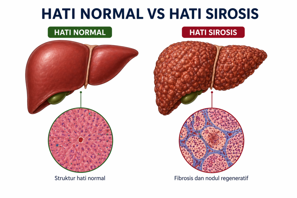 Sirosis merupakan penyakit hati kronis yang ditandai dengan pembentukan jaringan fibrosis dan nodul abnormal di permukaan hati akibat infeksi virus (hepatitis B, C, atau D), toksin (alkohol, obat), genetik, autoimun, atau penyebab yang tidak diketahui.1